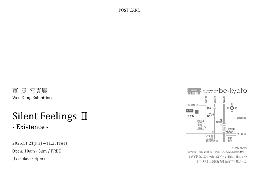 Wen Dong 写真展「Silent Feelings Ⅱ -Existence-」 日程:11月21日(金)〜11月25日(火) 会場:be-kyoto gallery(京都市) 時間:10:00〜17:00(最終日16:00まで)