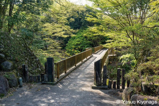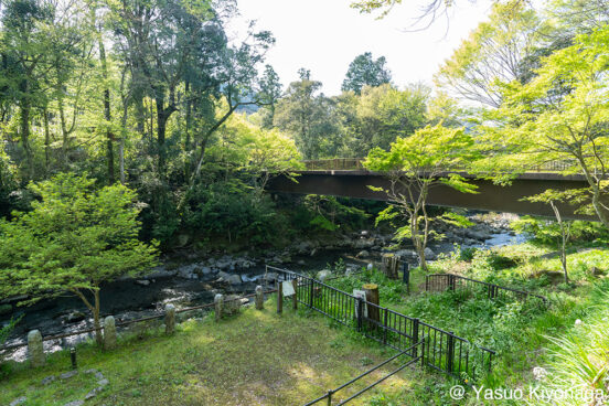 文人たちを魅了した湯ヶ島温泉は、狩野川の渓流に沿って旅館がポツポツと点在し、地元の人だけでなく観光客も利用できる共同浴場もある。この共同浴場に通うために作られた散歩道「湯道」があり、現在は宿泊客たちの散策コースとして人気スポットになっている。「湯道」はゆっくり歩いて30〜40分。鬱蒼とした木立に囲まれ川に沿った細い道が続く。都会の喧騒を離れて、鳥の声と川の水音しか聞こえない静けさの中を歩いていると、何だか自分も温泉宿で執筆している文人になったような気分になる。「湯道」のメインスポットは「出会い橋」と呼ばれる二つの橋。黄色い手すりが目立つ「男橋」と「女橋」で、ここで本谷(ほんたに)川と猫越(ねっこ)川が合流し、狩野川となる。この二つの川と二つの橋が出会う場所ということで「出会い橋」と名付けられたそうだ。
