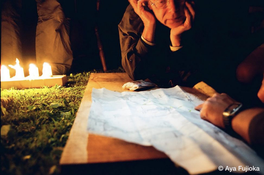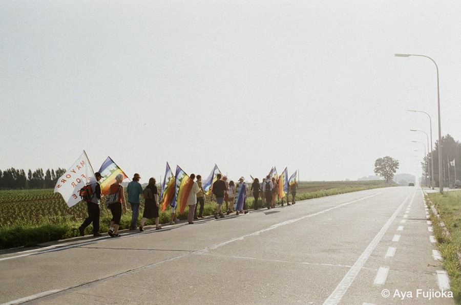 このピースウォークは、核兵器廃絶を目指すための国際的な平和活動で、出発地のイペールは、化学兵器が使用された最初の場所として広島と同様に「平和都市」と呼ばれる町でした。写真には、レインボーフラッグを携え歩く一行や、田園風景に佇む牛、一行を眺める住民、ダイインや核廃絶のためのパフォーマンスが記録されていますが、過酷な道中では「途中から写真を撮ることなどどうでも良くなるほど」さまざまなイベントに巻き込まれ、「自分がなにをやっているかもわからず、平和運動をしてしまった」と作家は振り返ります。このピースウォークの10年後、藤岡は広島に戻り、やがて『川はゆく』へと結実することになります。