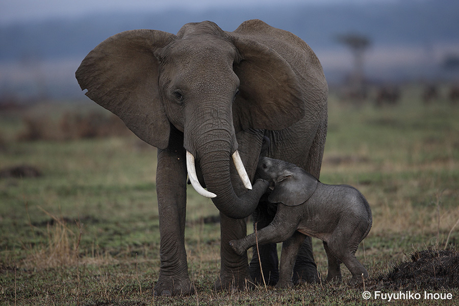 お乳が高すぎて背伸びをしなければ届かない子ゾウ。 よろける子どもの足を支えるように母の鼻が伸びてきました。 何気ない愛情の瞬間が私にとってのシャッターチャンスです。