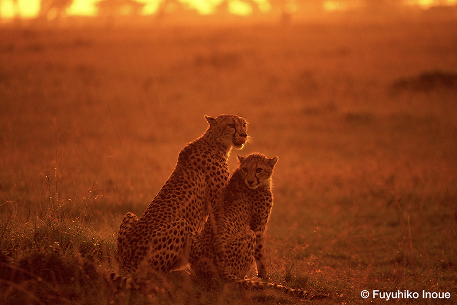 スコールの中でたたずむチーター親子。 大雨にもかかわらず、日没直前、空が黄金色に輝き始めた時の感動は忘れられません。
