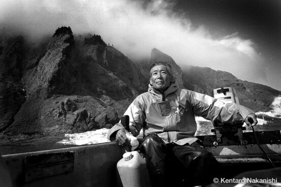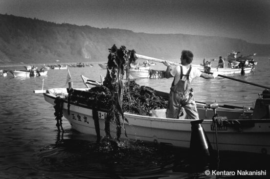 漁初日(かぎおろし)、海中の昆布を探る漁船群