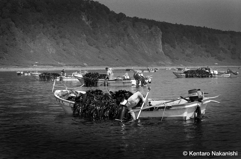 漁初日(かぎおろし)、海中の昆布を探る漁船群